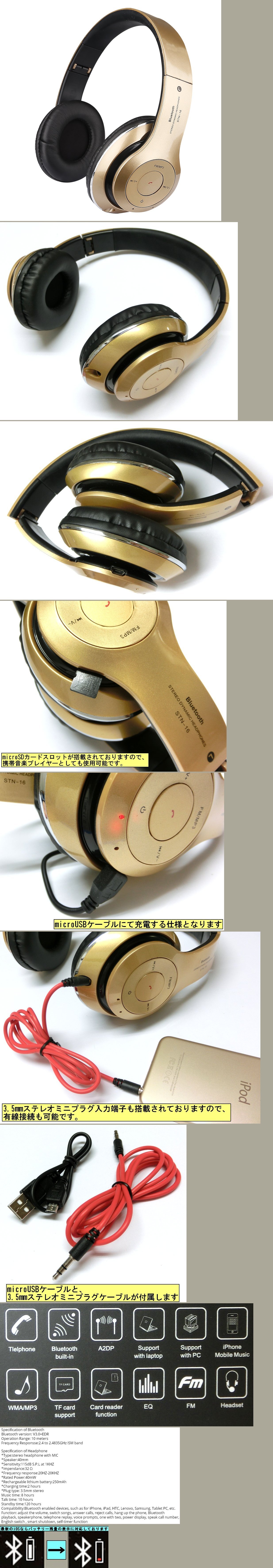 Bluetoothヘッドホンです。折りたたみも可能ですので、携帯性にも優れています。携帯電話やPCにて使用可能です。電源は内蔵バッテリーへ付属のmicroUSBケーブルにて充電する仕様です。バッテリー残量は、最新のiOSですと、ブルートゥースマークの横に残量インジケーターが表示されます。PCや各種Bluetoothに対応した機器でも使用可能です。microSDカードスロットも搭載されておりますので、音楽プレイヤーとしても使用可能です。3.5mmステレオミニプラグ入力端子も搭載されておりますので、有線接続も可能です。また、英語で音声ガイダンスが流れますので、操作の目安になります。詳しい仕様は画像クリックにて、ご参照ください。 ※付属するマニュアルは外国語表記となります。 ※パッケージはございません。 ※当店での動作確認機種=[Bluetooth対応PC]:[iOS9]:[iPodtouch6での音楽再生]等 ※3.5mmステレオミニプラグケーブル長=約105cm |